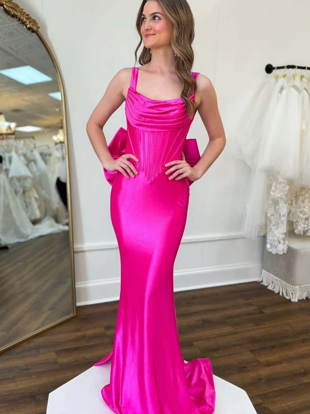 Sleek, sexy, and sophisticated. The hot pink satin and elegant cowl neck drape create a fluid, curve-hugging mermaid silhouette that commands attention.