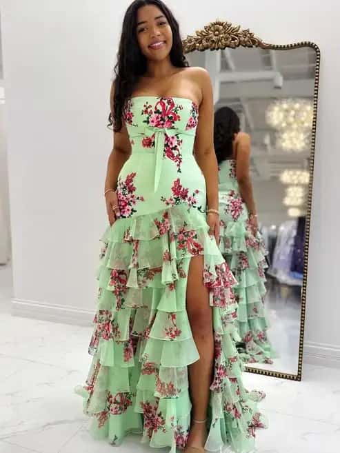 Mint Green Floral Print Prom Dress with Strapless