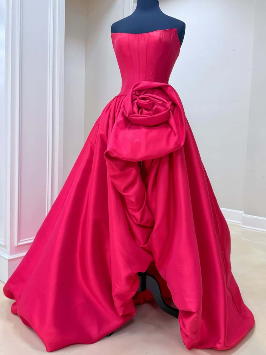 Minimalist elegance meets dramatic artistry. This sleek satin strapless gown is elevated by a stunning 3D rose accent, offering a modern and sophisticated look that speaks volumes with its refined details.