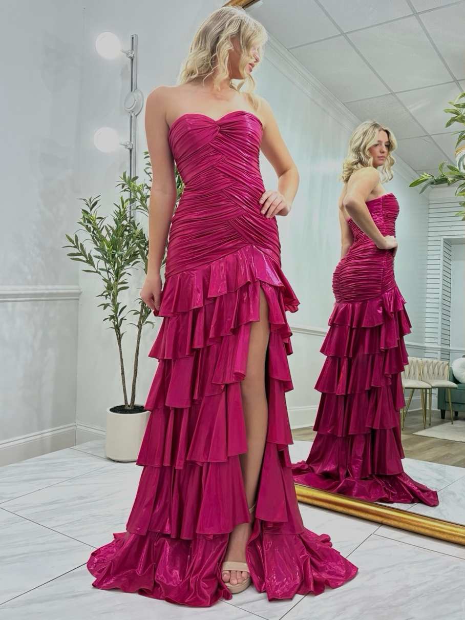 Make a bold, unforgettable statement in this Stunning Strapless Fuchsia Ruffled High Slit Prom Dress. The dramatic high slit offers a daring, leg-baring touch that elongates the silhouette and adds modern edge. The strapless sweetheart neckline ensures a secure, flattering fit, letting you dance the night away with confidence.