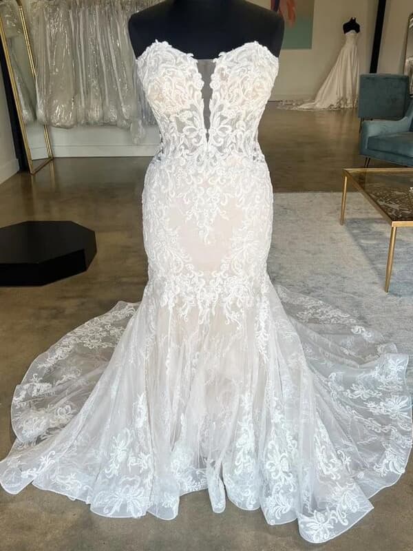 A celebration of curves and intricate detail. This stunning wedding dress features a classic sweetheart neckline and a curve-hugging mermaid silhouette, beautifully adorned with delicate applique work for a look of luxurious romance.