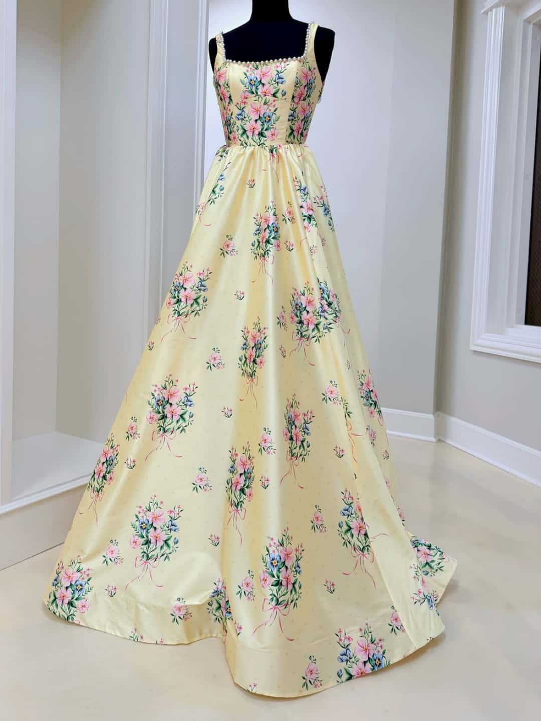 Yellow Square Neck A-Line Floral Print Prom Dress